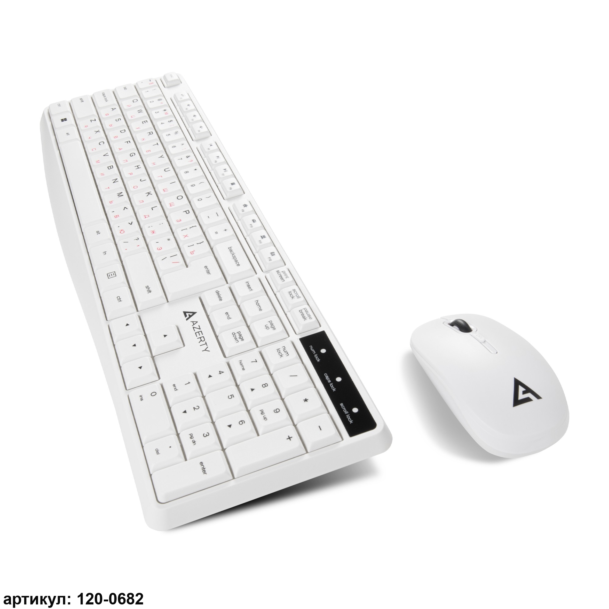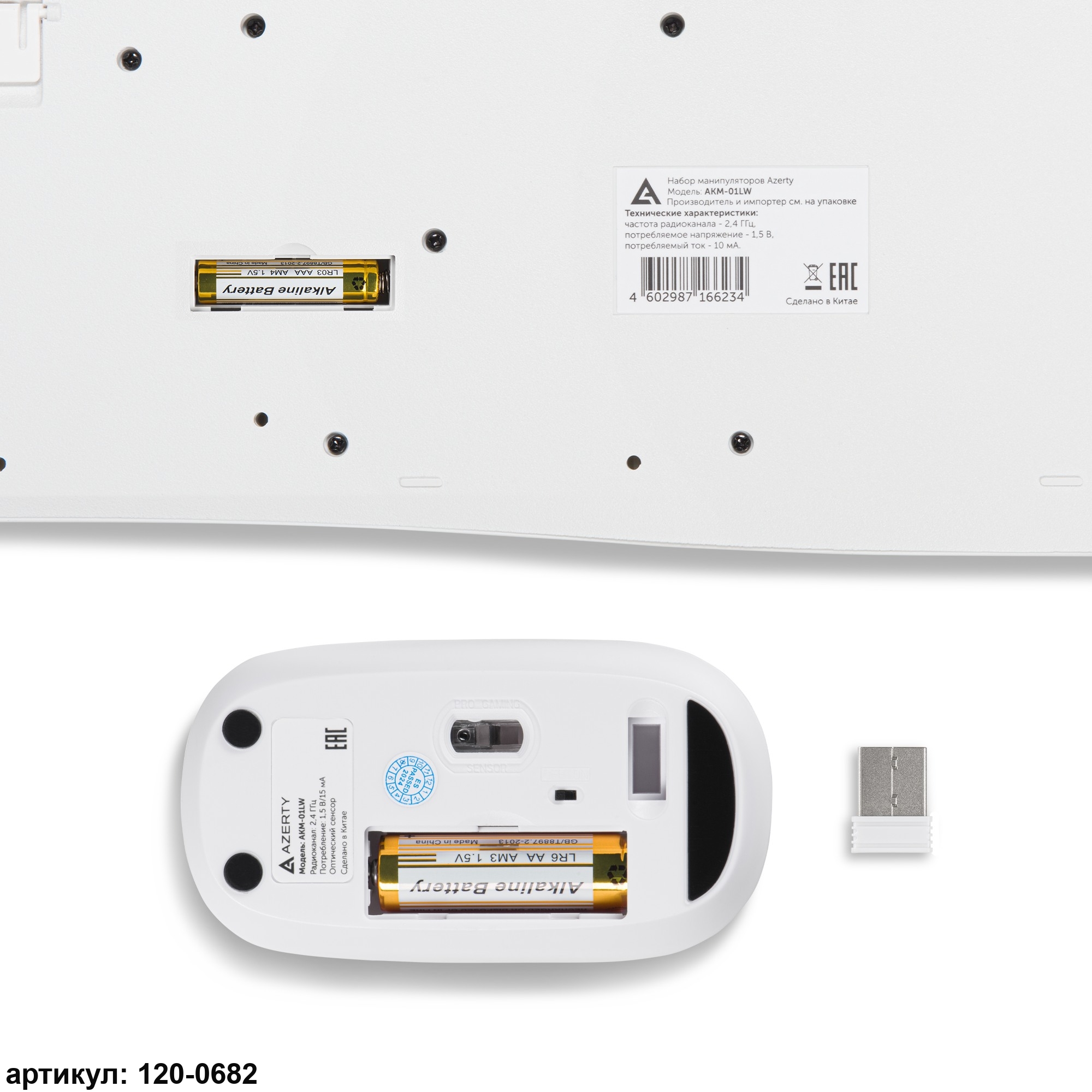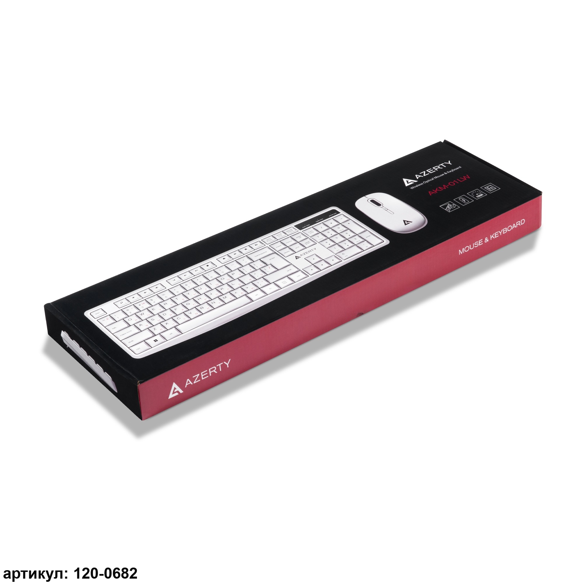 Комплект манипуляторов Azerty AKM-01LW состоит из клавиатуры и мыши. Он может использоваться для комплексного управления и ввода данных на персональных компьютерах и других совместимых устройствах, таких как планшеты и телевизионные приставки. Устройства изготовлены из безопасного и прочного пластика белого цвета. Материал имеет приятную на ощупь фактуру и износостоек. Клавиатура мембранного типа является полноразмерной, со 104 клавишами (ресурс 10 млн. нажатий), а оптическая мышь – светодиодной, с двумя рабочими клавишами (ресурс 3 млн. нажатий), кнопкой-колесом и кнопкой переключения разрешения. Мышь имеет симметричный дизайн, подходящий для использования как правой, так и левой рукой.