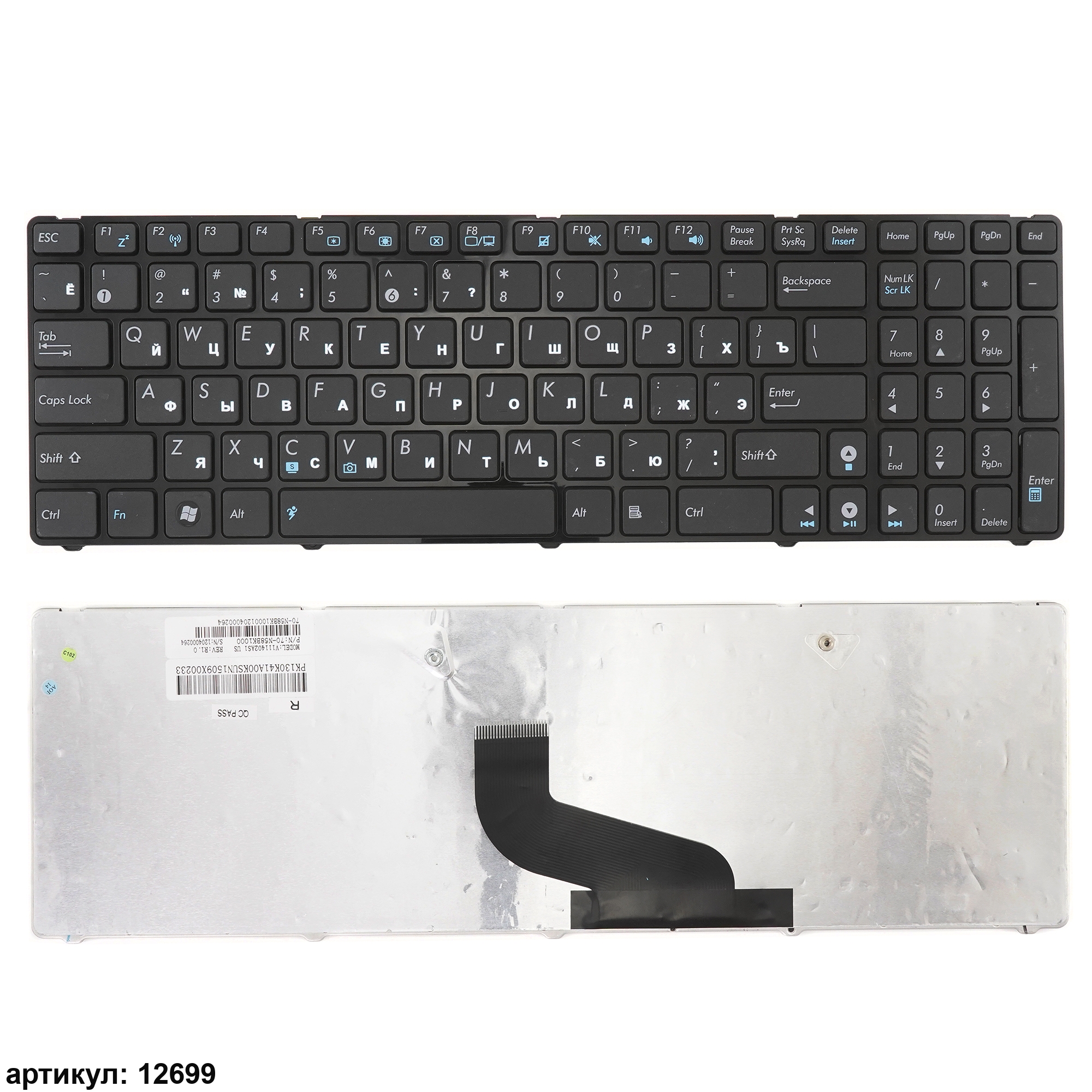 Клавиатура подходит к ноутбукам: Asus X54, X54C, X54L, X54HR, X54HY, X54LY, A53, X53, X54, A53T, A53U, A53Z, K53B, K53T, K73M, 53TA, K73BY, K53Z, X53U, X53Z, K53, K73Совместимые P/n: V118502AS1-RU, V118502AS1, MP-10A73SU-6983, SG-47600-XAA, SN7114, PK130K31A05, V111402AS2, 70-N58BK1700, V111402AS1, V118502AS1, PK130J22A05, 70-N5I1K700, MB348-005