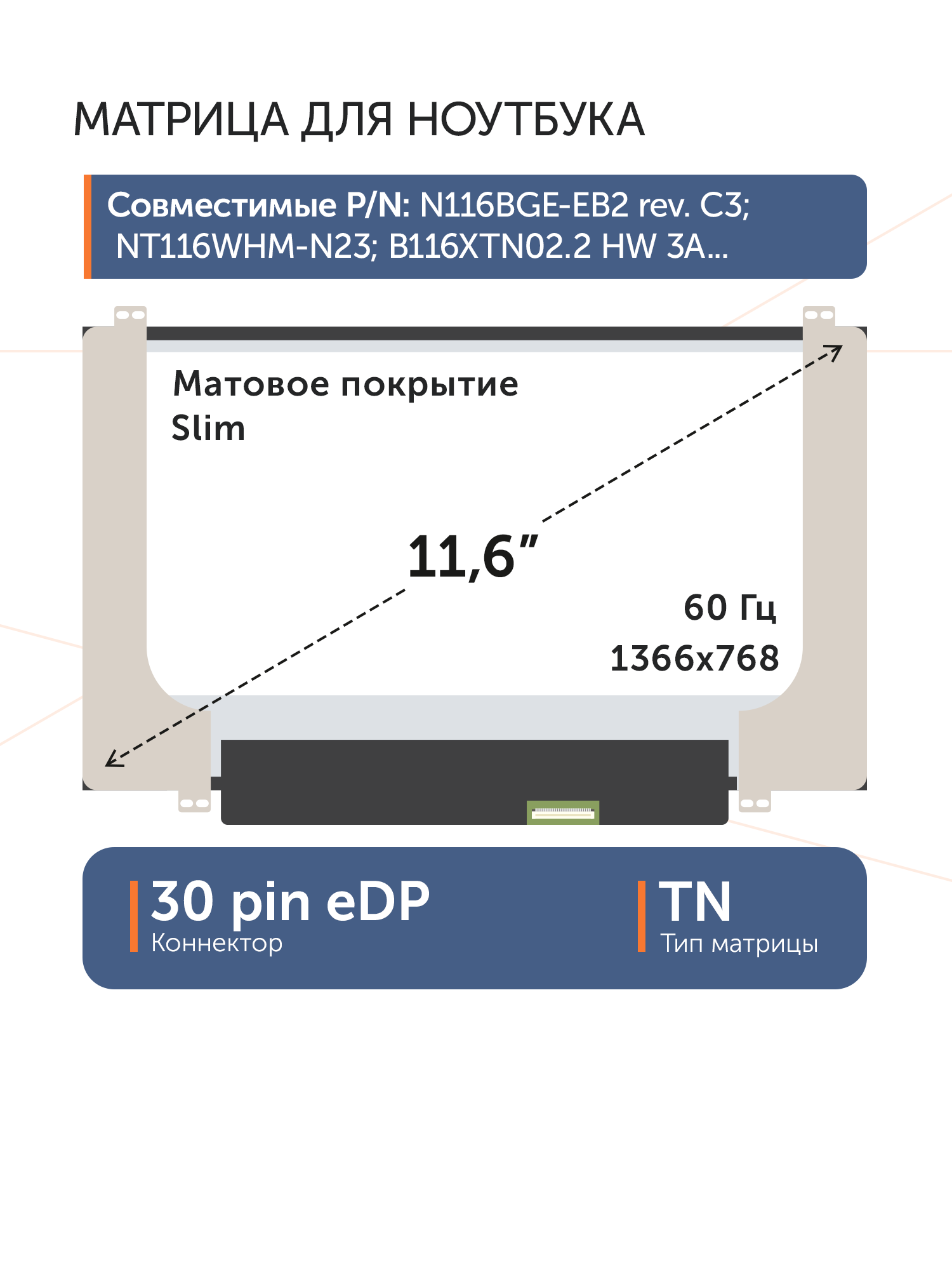 Совместимые модели: N116BGE-E32, B116XTN01.0, N116BGE-E42 Rev.C1, N116BGE-E42 Bev.B1, N116BGE-E32