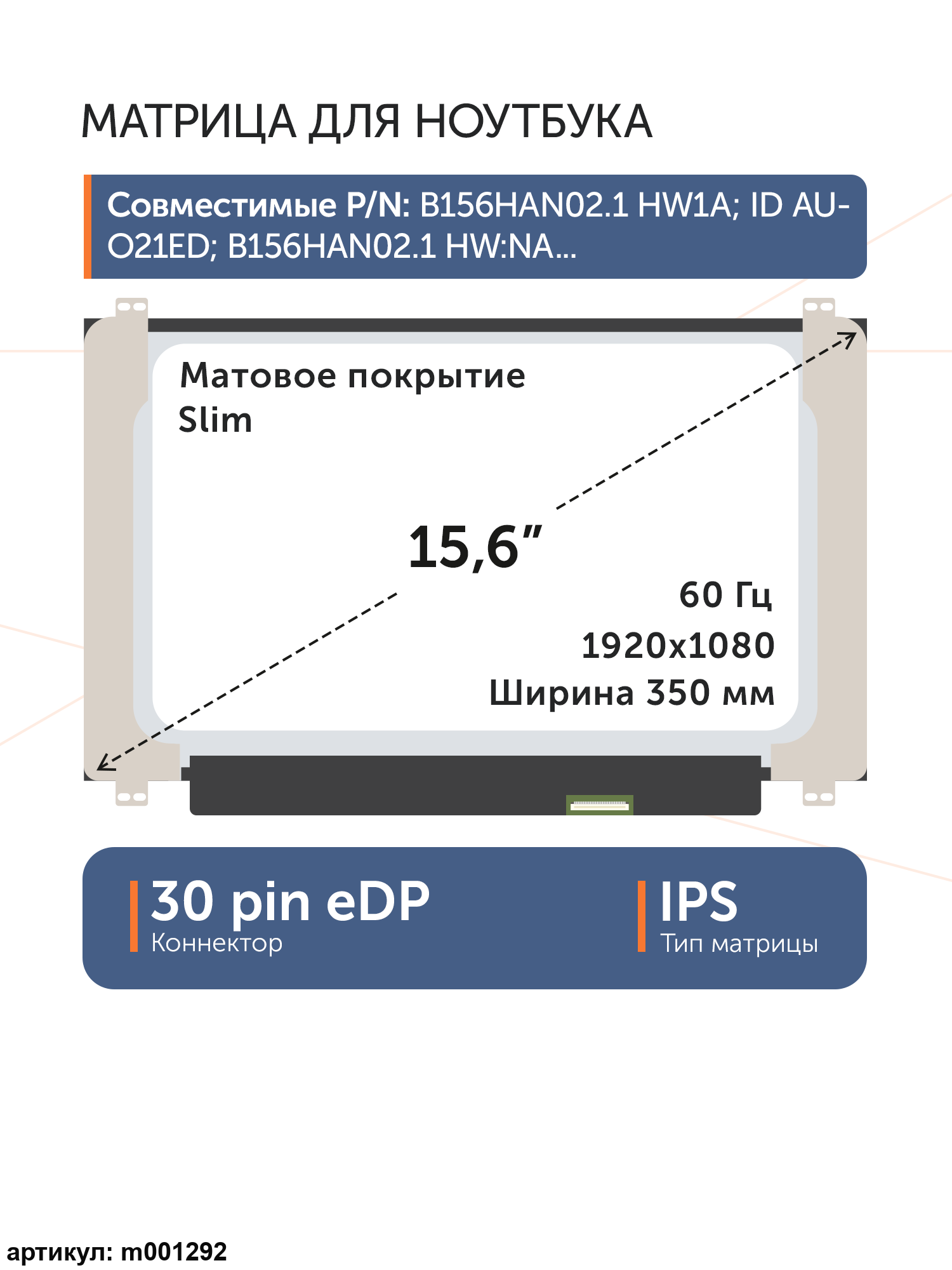 Совместимые модели: B156HAN02.2, B156HAN02.7, B156HAN02.3, B156HAN02.8, B156HAN02.1, LM156LFCL03, LM156LFCL13, LM156LFBL02, LM156LF4L01, LM156LFCL11, LM156LFCL01, LM156LFCL10, LM156LFAL01, LM156LF5L03, LM156LFCL05, LM156LFBL03, LM156LFCL07, LM156LFCL12, LM156LFAL02, LM156LF5L06, LM156LF5L04, LP156WF5(SP)(A2), LP156WF9(SP)(L2), LP156WF9(SP)(L9), LP156WF9(SP)(L1), LP156WF9(SP)(K1), LP156WF9(SP)(M3), LP156WF9(SP)(M9), LP156WF9(SP)(M1), LP156WF9(SP)(C1), LP156WFC(SP)(C1), LP156WFF(SP)(B1), LP156WFC(SP)(D2), LP156WFC(SP)(D3), LP156WFC(SP)(D5), LP156WFC(SP)(D7), LP156WFC(SP)(D1), N156HCA-EBB, N156HCA-EBA, N156HCA-EAB, NV156FHM-N48, NV156FHM-N35, NV156FHM-N45, NV156FHM-N4S, NV156FHM-N3D, LP156WFC(SP)(F6), NE156FHM-N41, NE156FHM-NS0, NV156FHM-N4X, TV156FHM-NH1