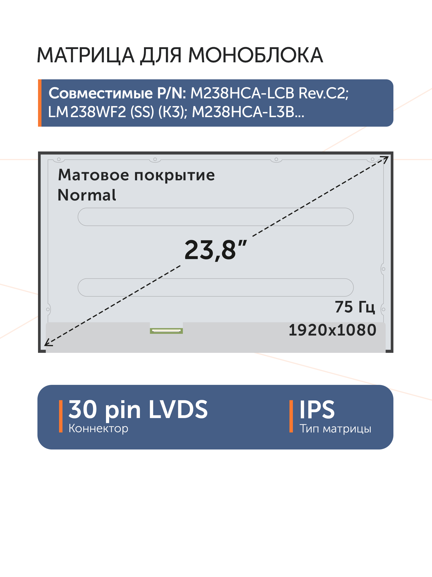 Матрица стандарт (normal)Разъем расположен снизу слева.Совместимые P/N: M238HCA-LCB Rev.CC, M238HCA-LCB Rev.CB, M238HCA-LCB Rev.C2, M238HCA-LCB