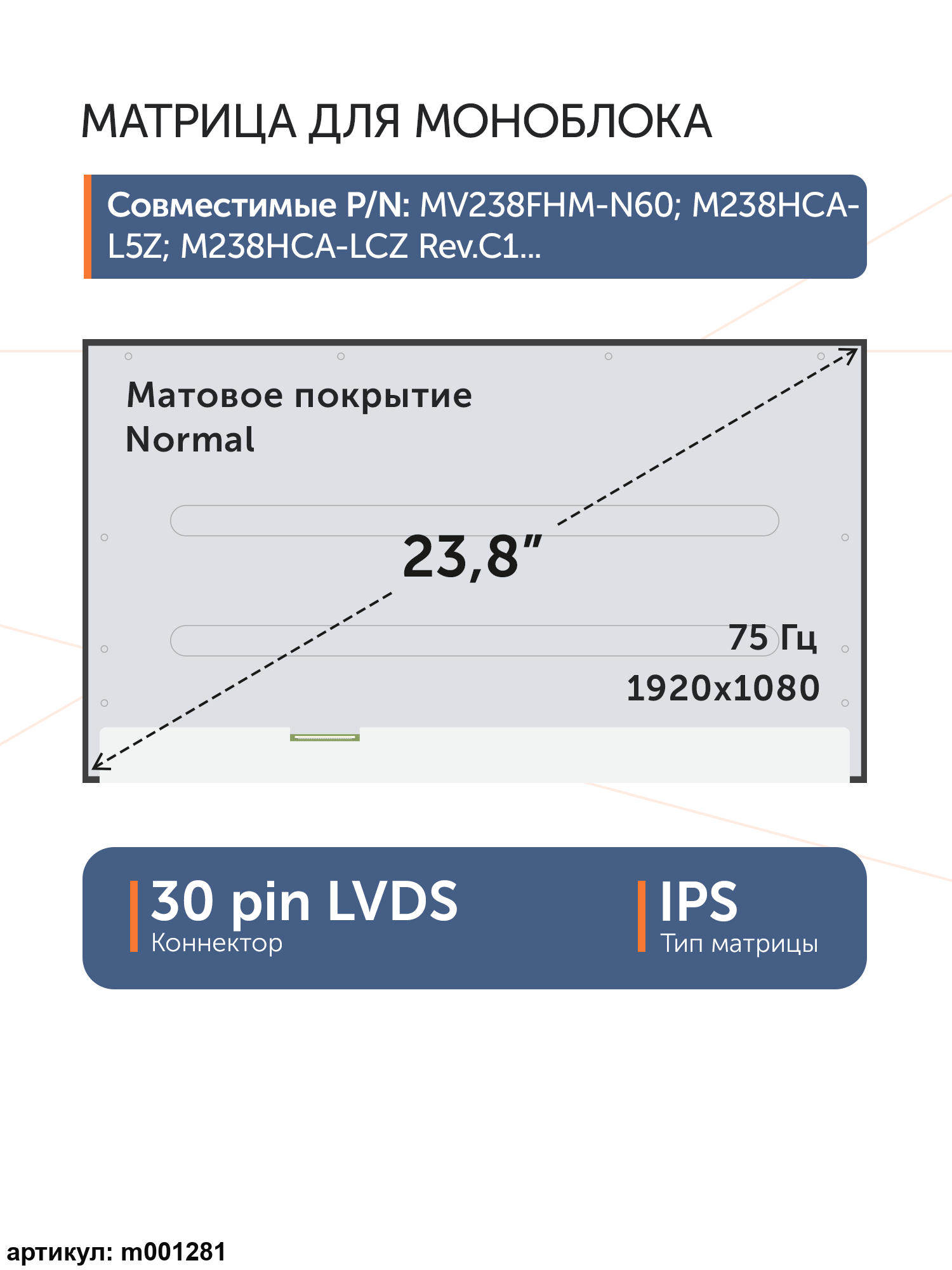 Матрица для моноблокаРасположение разъема снизу слева.Совместимые модели: M238HCA-L5Z, M238HCA-LCZ Rev.C1, M238HCA-LCZ Rev.C2, MV238FHM-N60, MV238FHM-N61, MV238FHM-N62