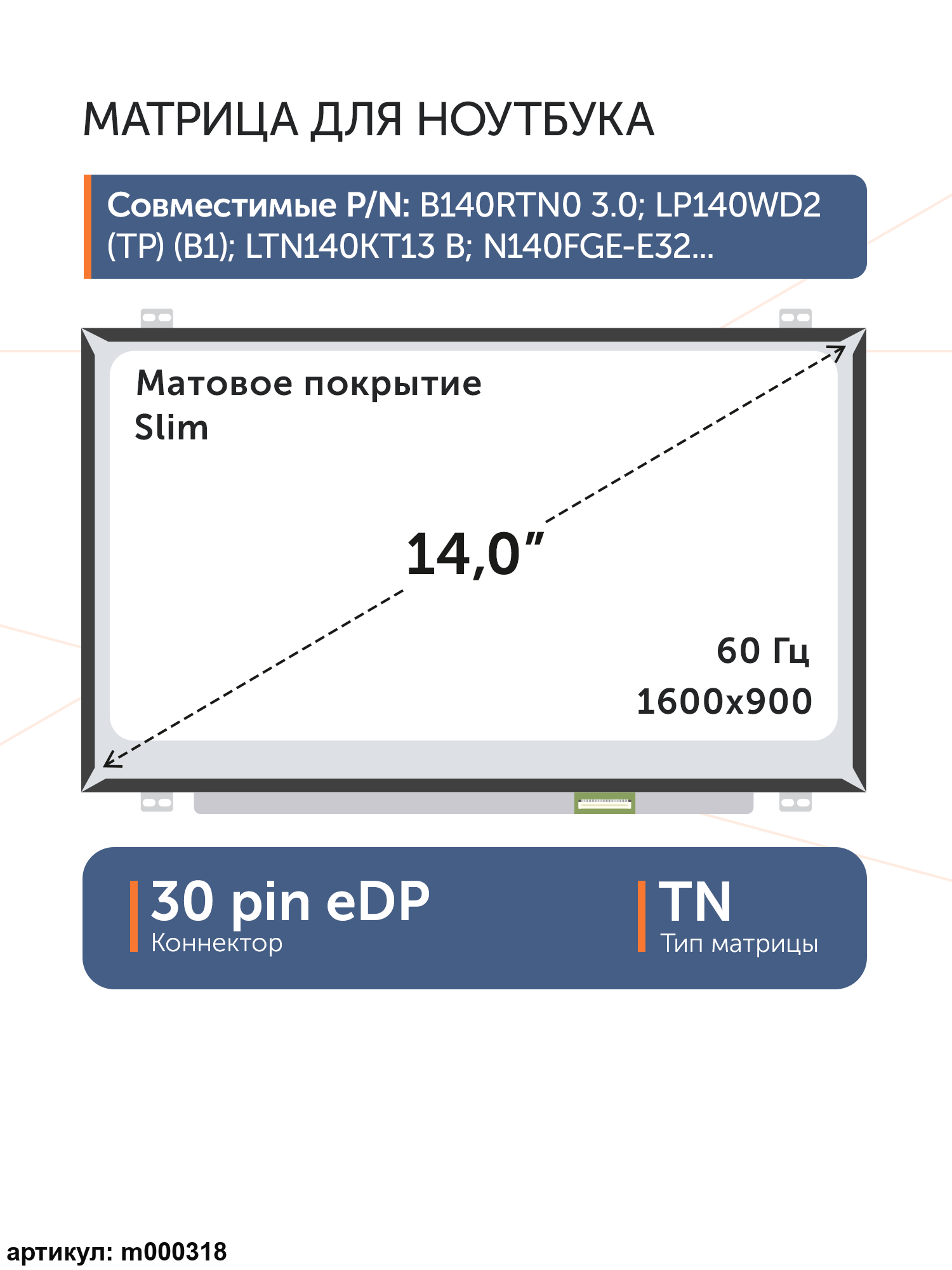 Матрица тонкая (slim), крепления (ушки) расположены сверху и снизу. Разъем расположен снизу справа на внешней плате.
