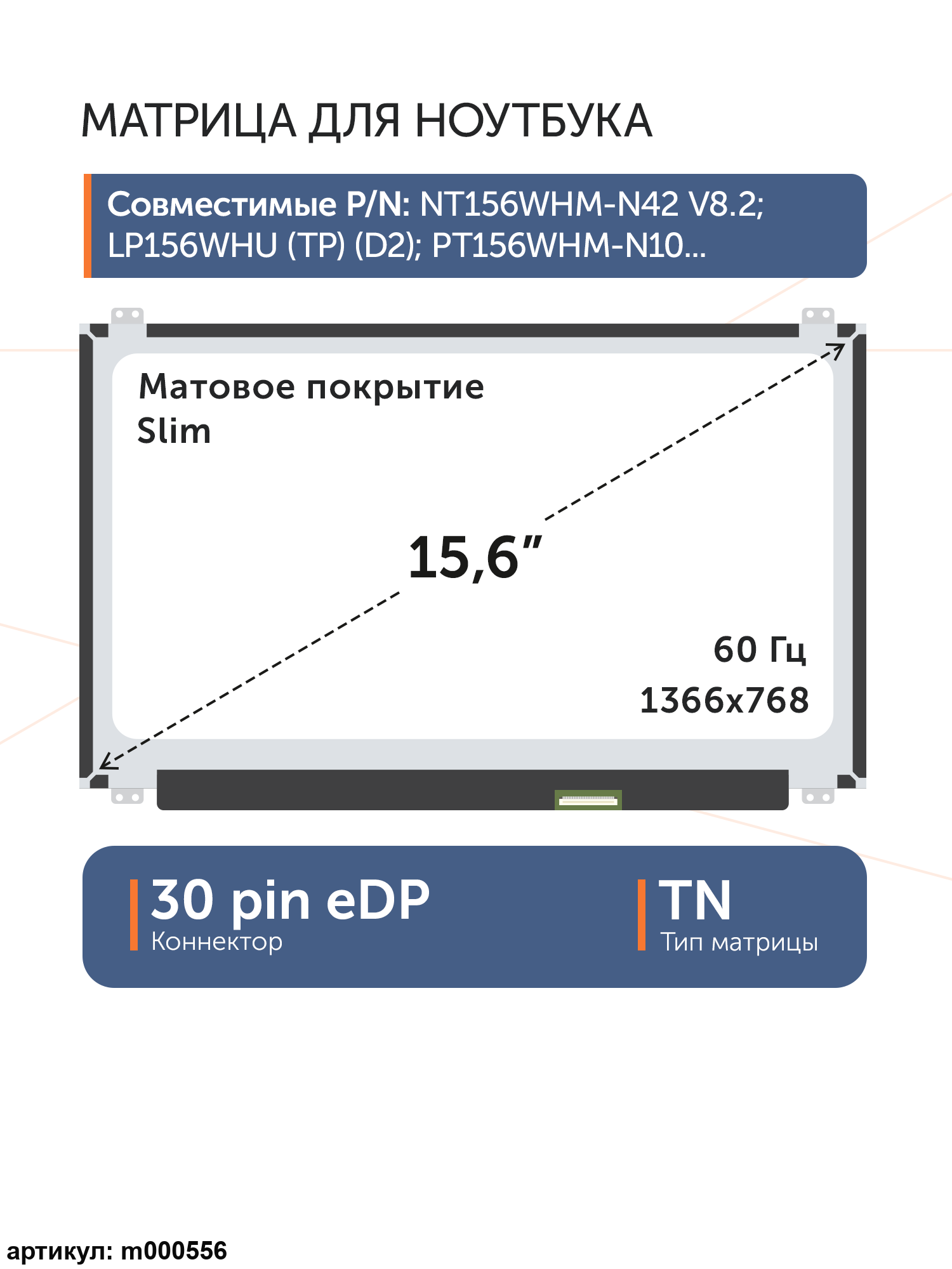 Совместимые модели: NT156WHM-N42 V8.2, LP156WHU(TP)(D2), PT156WHM-N10, LP156WHB(TP)(GD), LP156WHU-TPF1, LP156WHU(TP)(F1), B156XTN04.4, LP156WHB-TPH1, LP156WHB(TP)(H1), LP156WHB(TP)(A2), B156XTN03.1 , LP156WHB-TPG1, LP156WHB(TP)(G1), NT156WHM-N38, NT156WHM-N32 V8.0, LP156WHU(TP)(G1), NT156WHM-N32, LP156WHU-TPE1, LP156WHU(TP)(E1), LP156WHB-TPL1, LP156WHB(TP)(L1), LP156WHB-TPK1, LP156WHB(TP)(K1), LP156WHB-TPGA, LP156WHB(TP)(GA), LP156WHB-TPD3, LP156WHB(TP)(D3), LP156WHB(TP)(D2), N156BGA-EB2, LTN156AT38, NT156WHM-N42, LP156WHU(TP)(H1), N156BGA-EA2, B156XTN04.5, N156BGE-EB2, B156XTN07.0, B156XTN07.1, LP156WHB-TPC2, LP156WHB(TP)(C2), LP156WHB-TPC1, LP156WHB(TP)(C1), B156XTN04.6, LP156WHB-TPGB, LP156WHB(TP)(GB), LTN156AT39, N156BGE-EA2, N156BGE-E32, N156BGE-E42, LP156WHU(TP)(B2), LP156WHU-TPD1, LP156WHU(TP)(D1, LP156WHB-TPA1, LP156WHB(TP)(A1), LP156WHB(TP)(B1), NT156WHM-N21, NT156WHM-N12, NT156WHM-N22, LP156WHB-TPD1, LP156WHB(TP)(D1), LTN156AT37 401, LP156WH3-TPSH, LP156WH3(TP)(SH), LP156WH3-TPTH, LP156WH3(TP)(TH), B156XTN04.1, B156XTN04.0, LP156WHU-TPA1, LP156WHU(TP)(A1), N156BGE-E31, LP156WH3-TPT2, LP156WH3(TP)(T2), LP156WH3-TPS2, LP156WH3(TP)(S2), LTN156AT33 401, LP156WHU(TP)(B1), B156XW04 V.7, B156XTN03.5, N156BGE-E41, N156BGE-EB1, LTN156AT31, N156BGE-EA1, B156XW04 V.8, LP156WH3-TPS1, LP156WH3(TP)(S1), B156XTN03.3, B156XTN03.1