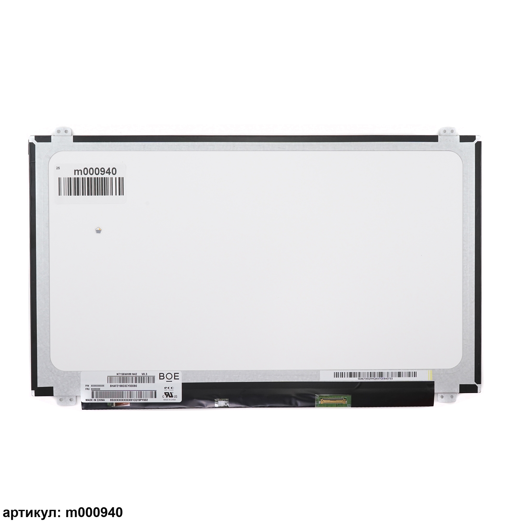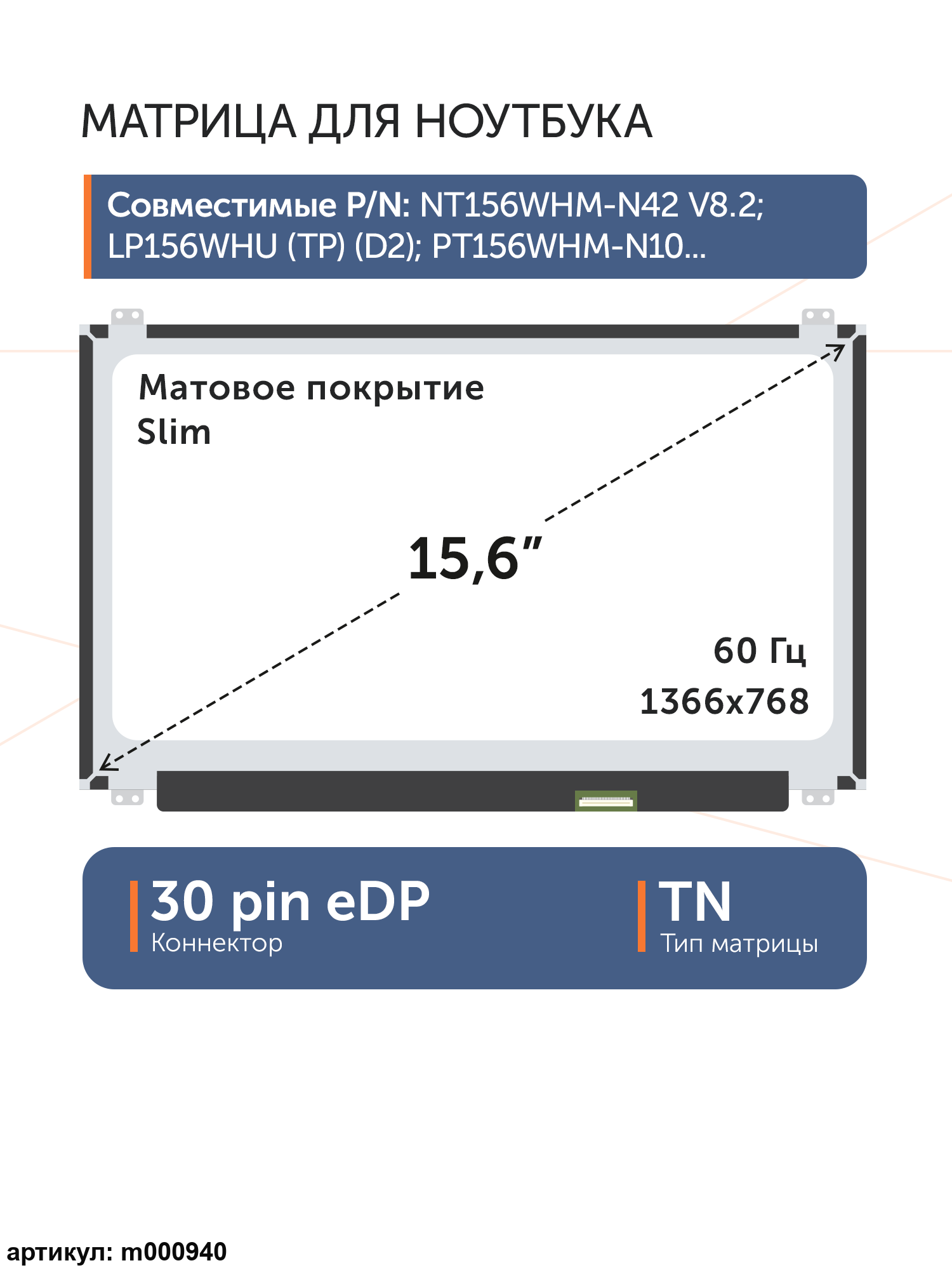 Матрица тонкая (Slim), крепления (ушки) расположены сверху и снизу.Разъем расположен снизу справа на внешней плате.Совместимые модели: B156XW04 V.7, LTN156AT31, B156XN03.5, B156XN03.1, N156BGE-EB1 Rev.C1, N156BGE-EA1, NT156WHM-N12, N156BGE-EB1 Rev.C2, LTN156AT39, LP156WHB (TP)(C2), LP156WHB-TPC2, LP156WHB (TP)(A1), LP156WHB-TPA1, N156BGE-EA2 Rev.B1, B156XTN07.0, N156BGA-EB2 Rev.C1, NT156WHM-N32, N156BGE-E32 Rev.C1, LP156WHU (TP)(A1), LP156WHU-TPA1, LP156WHB (TP)(GA), LP156WHB-TPGA, LP156WHB (TP)(L1), LP156WHB-TPL1, LP156WHB (TP)(K1), LP156WHB-TPK1, LP156WHU (TP)(E1), LP156WHU-TPE1, LP156WHB (TP)(GB), LP156WHB-TPGB, NT156WHM-N22, N156BGE-EA2 Rev.C1, LTN156AT33, B156XTN04.0, NT156WHM-N32 V.8, B156XTN04.6, LP156WHU (TP)(G1), LP156WHU-TPG1, B156XTN07.1, N156BGA-EA2 Rev.C1, N156BGE-E31 Rev.C1, NT156WHM-N42 V8.1, NT156WHM-N42 V8.2, NT156WHM-N42, NT156WHM-N32 V8.2, N156BGA-EA3 Rev.C4, B156XTN04.1, B156XTN04.5, LP156WHB-TPC1, LP156WHB (TP)(C1)