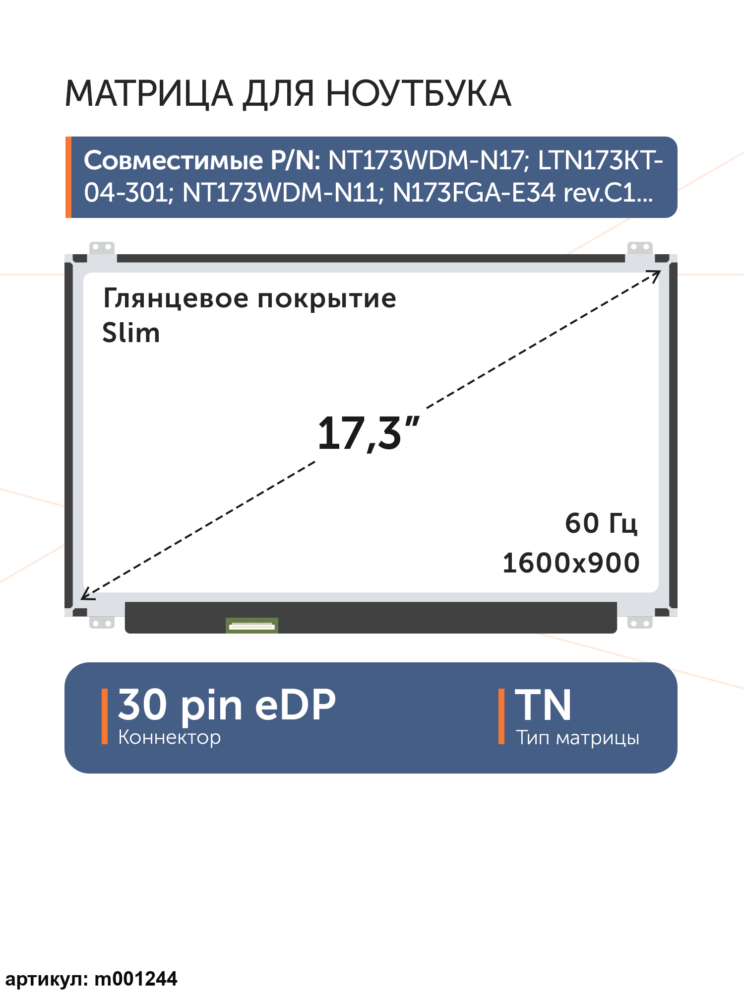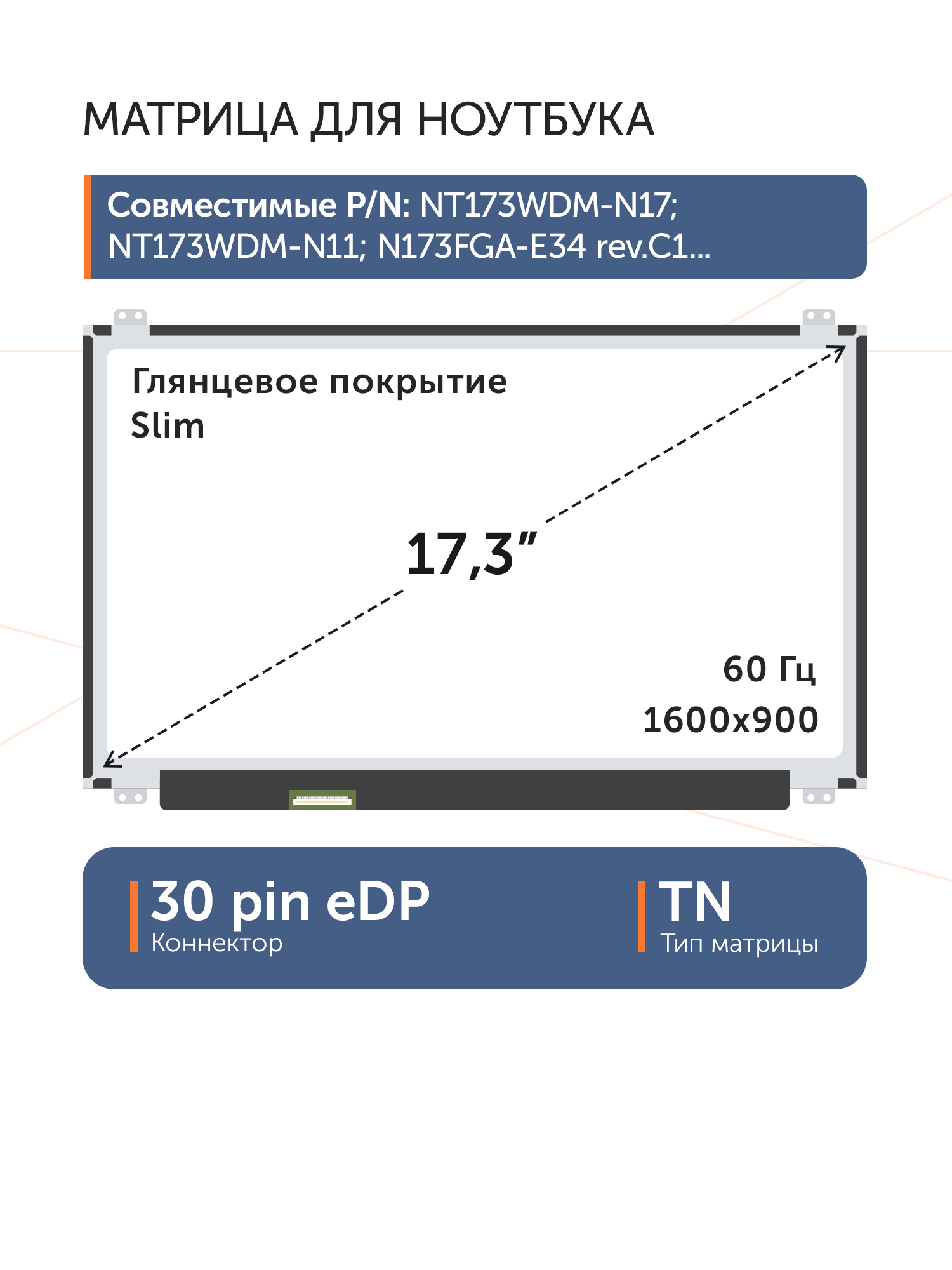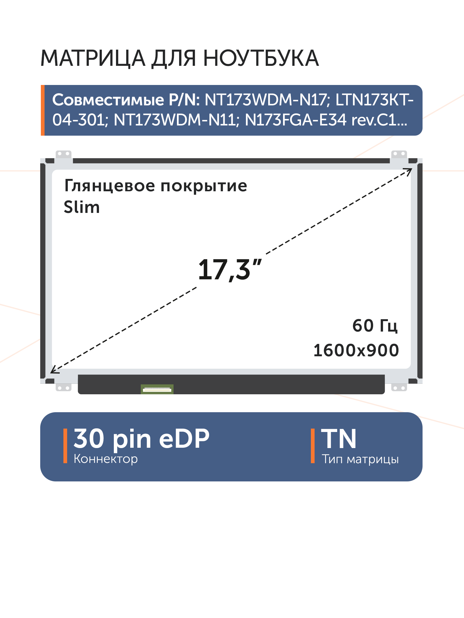 Совместимые модели: NT173WDM-N27 V8.0, NT173WDM-N27, NT173WDM-N17, B173RTN02.0, B173RTN02.1, N173FGA-E44, LTN173KT04-301, B173RTN02.2, NT173WDM-N11, N173FGA-E34 rev.C1, NT173WDM-N21