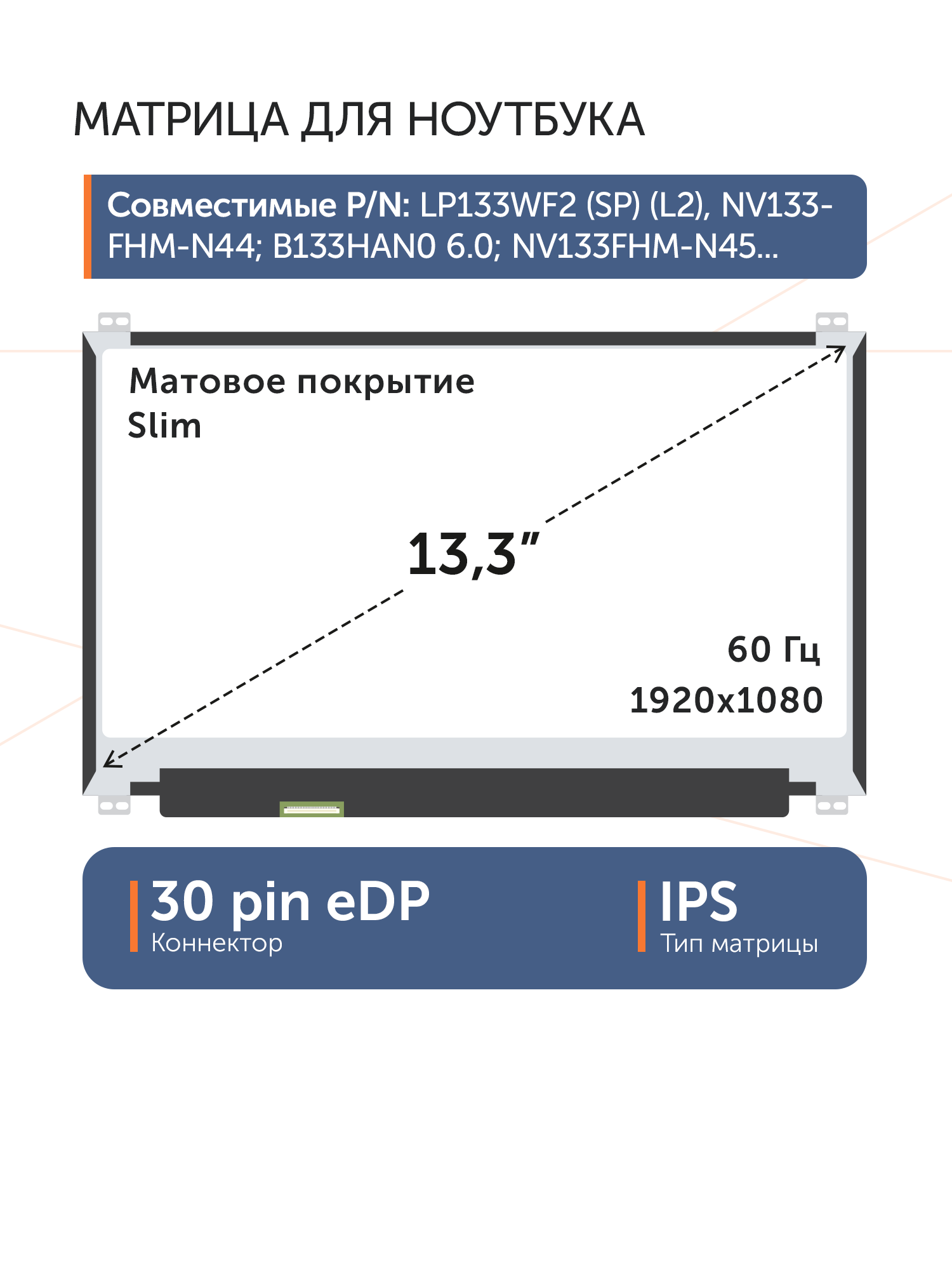 Совместимые модели: LP133WF2 (SP)(L2), NV133FHM-N44, B133HAN06.0, NV133FHM-N45, NV133FHM-N44, N133HCE-EAA Rev. B2, NV133FHM-N43